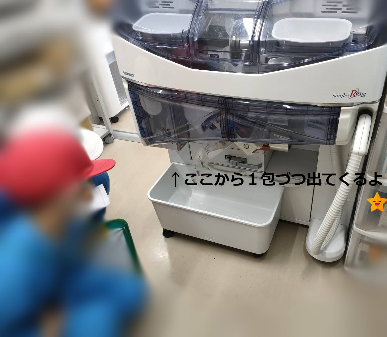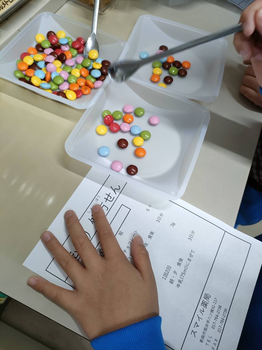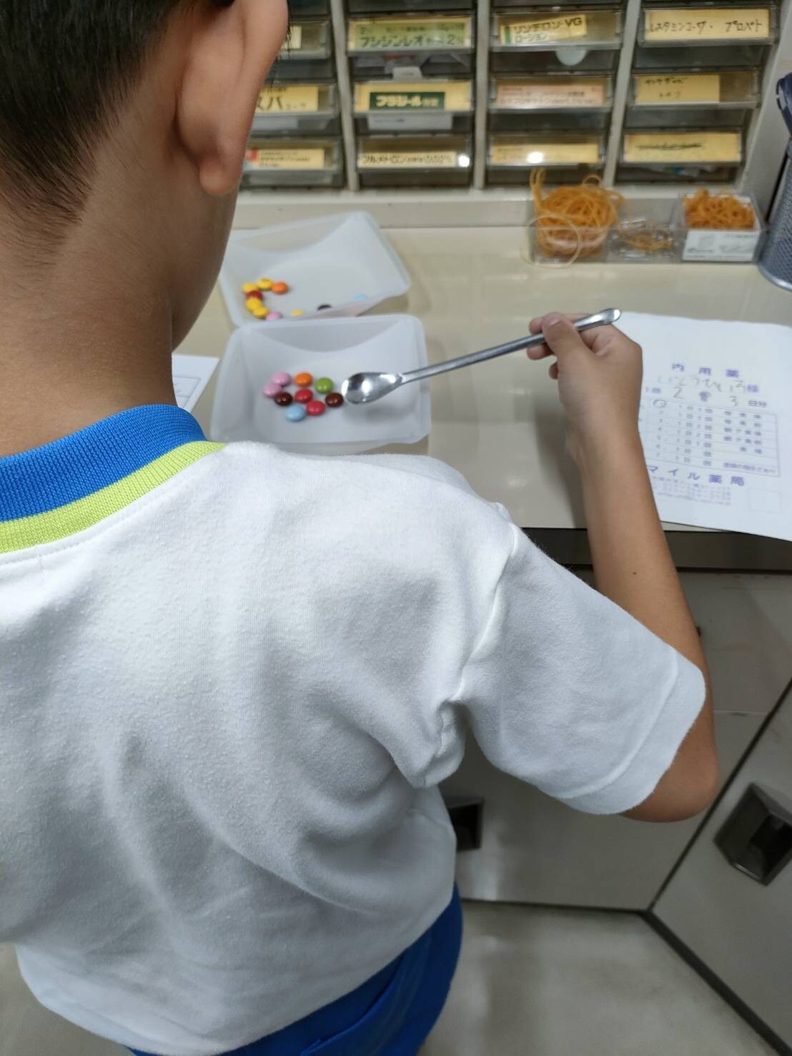 シロップが出来るところを見学したり、もぎ処方箋を使ってみんなで何g、何錠出るかを計算!